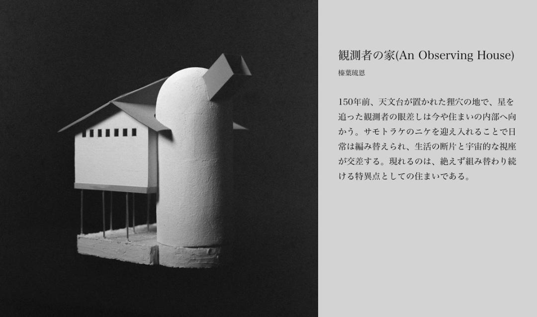 入選した作品は、3年生第1課題(担当:湯浅良介先生・工藤浩平先生)「みんなの居場所/プラットフォーム〈想像のレッスン〉」にて制作された 『観測者の家(An Observing House)』 です。